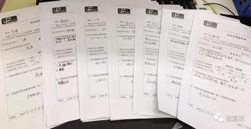 為進一步使公司員工提高執行力和凝聚向心力,培育積極向上的企業文化,增強企業競爭能力。德嘉麗集團于12月21日、23日、25日三天組織部分員工開展企業文化視頻培訓。分類分層次開展適應工作需要的知識、心態、行為和技能培訓。培訓是一種學習的方式,是提高業務知識和能力提升的有效手段,培訓結束后,大家紛紛表示受益匪淺、感觸很多并陸續提交了培訓反饋意見表。